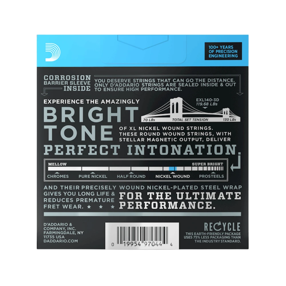 D’Addario offers 3 sets of strings in one convenient, cost-effective & environmentally friendly multipack. Each set is packaged in separate VCI bags for corrosion resistance, so they’re fresh when you’re ready to restring.